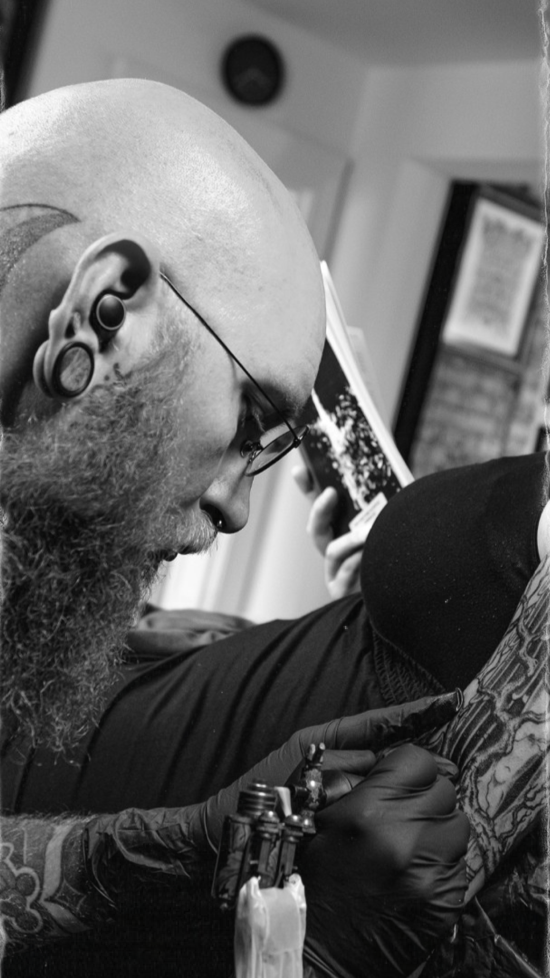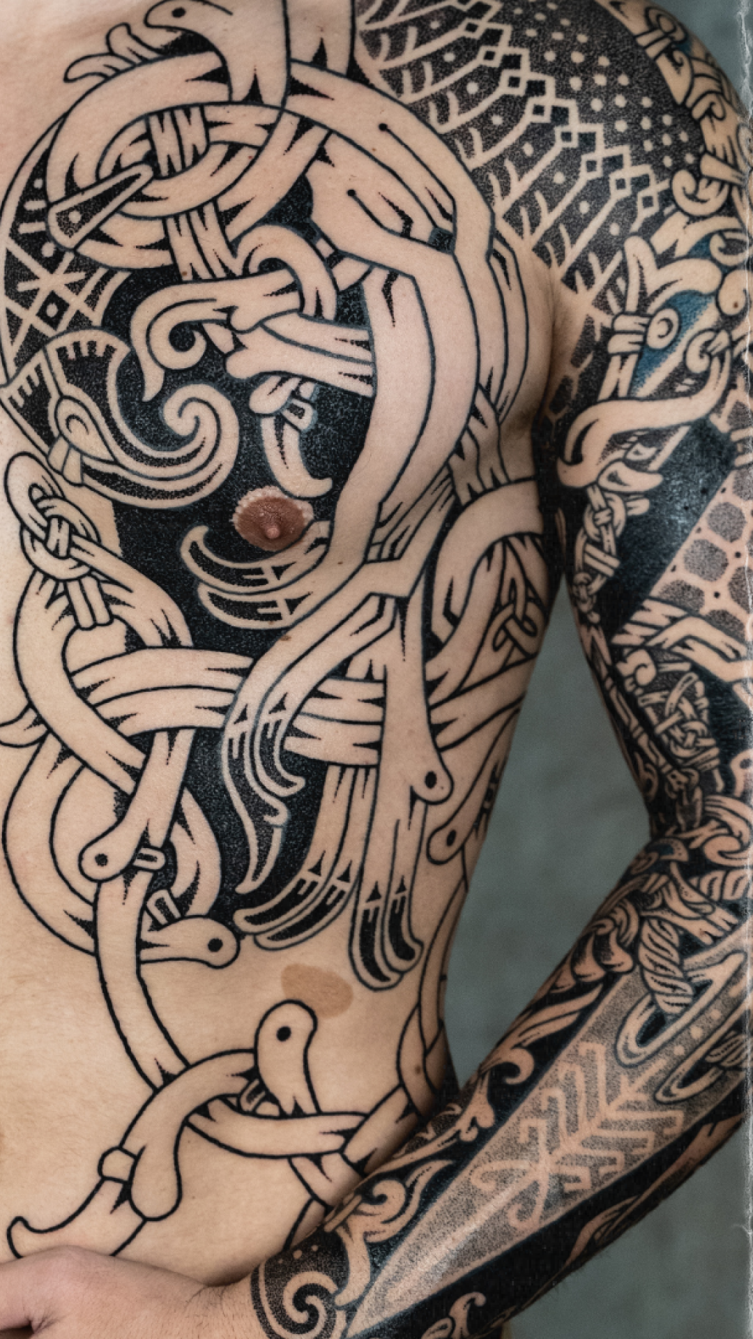 Isar Oakmund, owner of Northern Black, is a tattoo Artist, educator, and researcher based in Whitley Bay, England. He is widely recognized for his deep expertise in Nordic, Viking Age, and European historical tattooing. Isar is known for creating large-scale compositions with obsessive precision.
